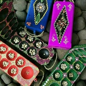 congklak dengan desain berbentuk Panjang dengan bahan kayu dihiasi corak bintik dan bunga yang menarik