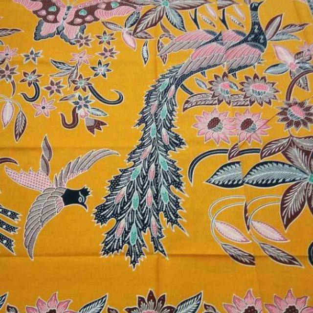 Name: Kain Batik Solo Motif Burung Merak Nangkring Warna Dasar Kuning Kunyit